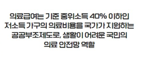 기준 중위소득이 40% 이하인 저소득 가구에게 국가가 의료비용을 지원하는 제도로, 생활이 어려운 국민의 의료 안전망 역할을 하고 있습니다. 진료 비용 중 본인부담액을 제외하고 지원하는 제도입니다.