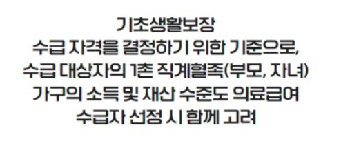 기초생활보장 수급 자격을 결정하기 위한 기준으로, 수급 대상자의 직계 혈족, 즉 부모와 자녀 가구의 소득 및 재산 수준도 의료급여 수급자 선정 시 함께 고려됩니다.