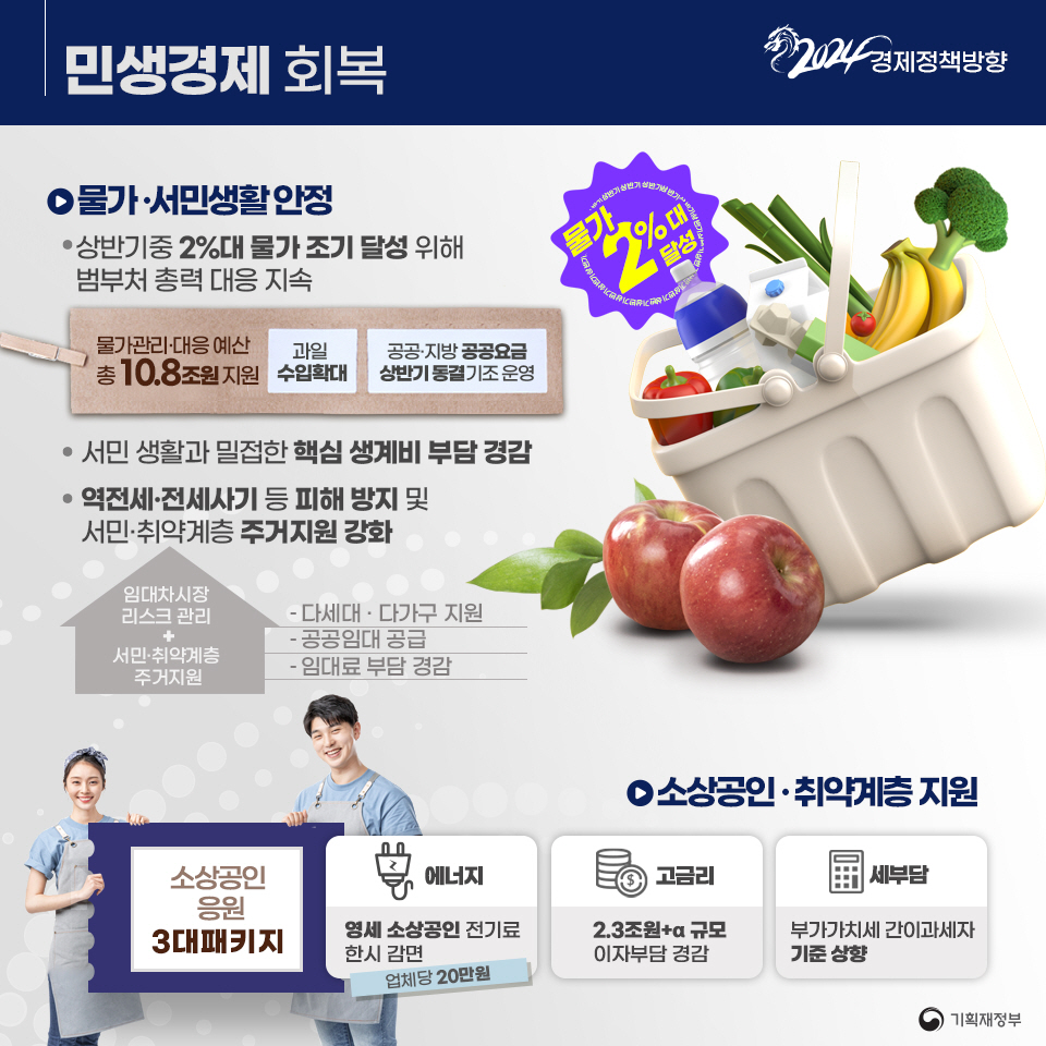 물가 안정 기조가 조속히 안착될 수 있도록 총력 대응하면서, 핵심 생계비 경감, 주거지원 등을 통해 서민 생활 부담 완화