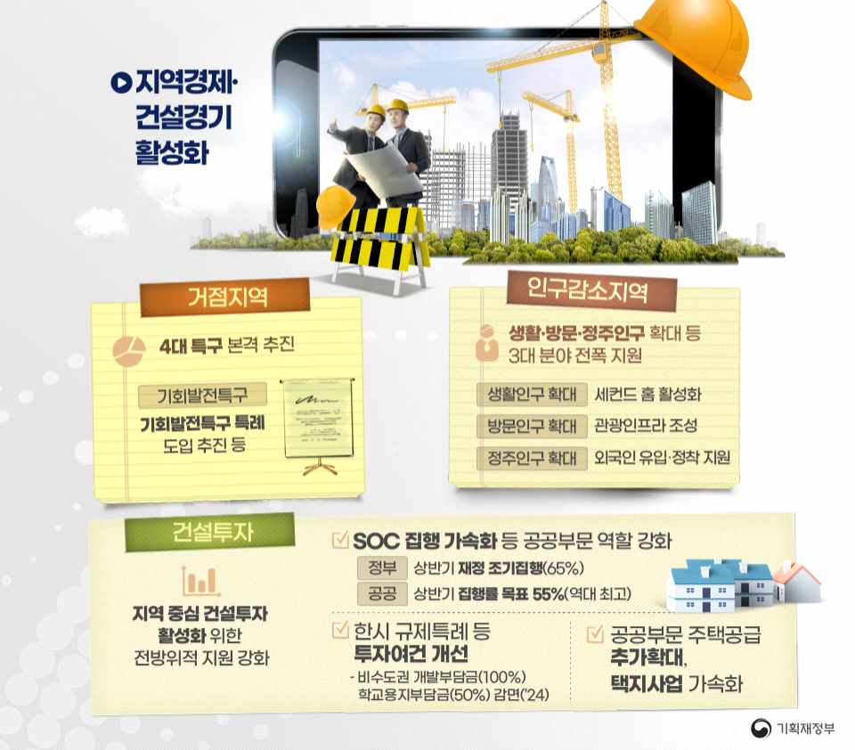 기회 발전 특구 등 거점지역 육성 및 인구 감소 지역 부활을 전폭 지원하고, 건설투자를 활성화하여 지역경제 회복을 적극 뒷받침
